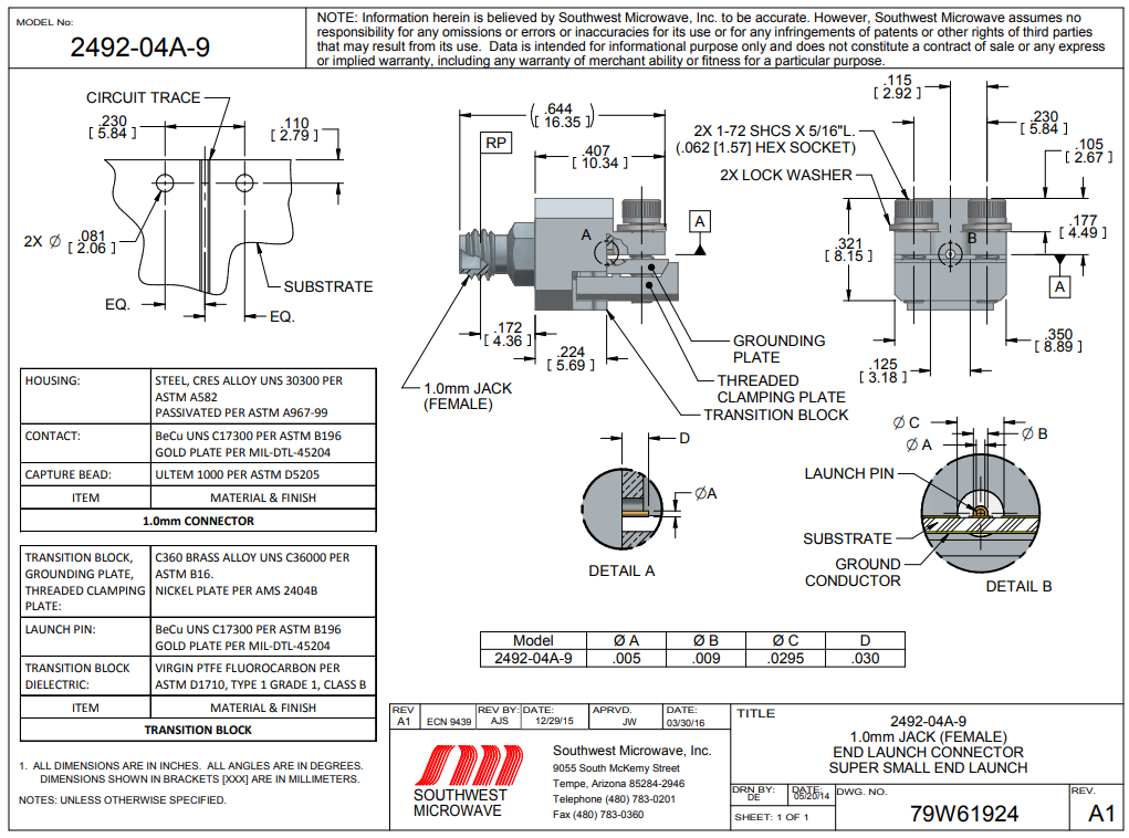 引腳/電材質直徑:0.005 / 0.0290