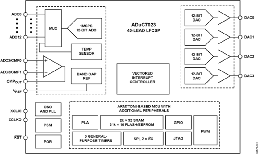 這(zhe)樣電(dian)子(zi)器件(jian)的(de)的(de)工作交流(liu)電(dian)壓范(fan)疇為(wei)(wei)2.7 V至(zhi)3.6 V,穩定體溫(wen)表范(fan)疇為(wei)(wei)-40°C至(zhi)+ 125°C工業化體溫(wen)表范(fan)疇。ADuC7023所采用32引腳(jiao)或(huo)40引腳(jiao)LFCSP芯片封(feng)裝。還提供了36球晶圓(yuan)級CSP封(feng)裝(WLCSP)。