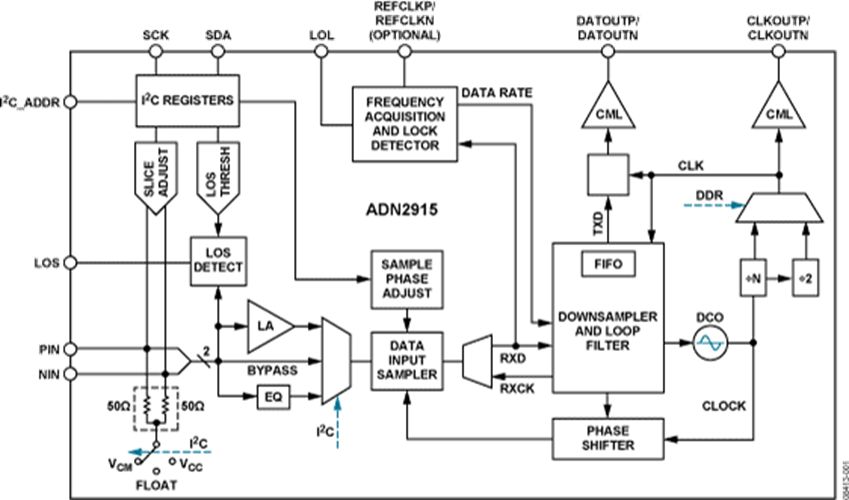 ADN2915ACPZ還可以支持偽隨時二進制編碼序列(PRBS)生產、位出錯探測和進入數據統計濃度回讀工作。 ADN2915ACPZ所采用寬敞型4 mm x 4 mm、24引腳單片機芯片級(LFCSP)芯片封裝。整個型號規格均相對比較于?40°C至+85°C條件的溫度而言的,必須另有表示。