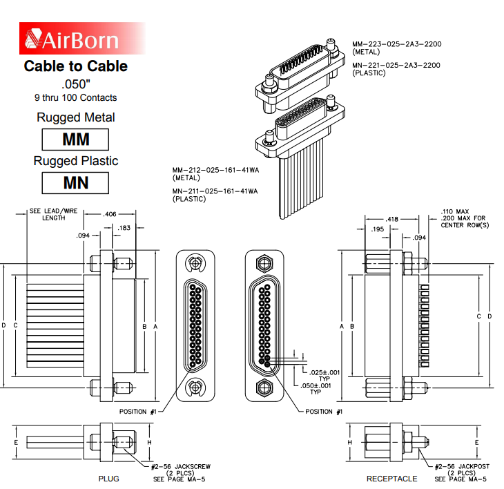 一品類公頭金屬材質連到器,有兩排,排3和四排接點,跨距為0.050“。某些連到器有焊杯,壓接線柱和尾纖端接方式。它是的長度領域為9到51接點。