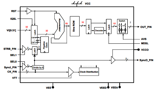 正(zheng)常保持模(mo)式的DAC或高達第三奈奎斯特帶約5.4 GHz的返回到(dao)零模(mo)式的DAC。初始階段(duan)可以(yi)(yi)重置為零度開始。該芯(xin)片(pian)有一對互補模(mo)擬輸(shu)出(chu)50Ω后(hou)端。輸(shu)出(chu)波形(xing)的頻(pin)率(lv)(lv)(lv)(lv)可以(yi)(yi)由三十(shi)二個(ge)(ge)頻(pin)率(lv)(lv)(lv)(lv)控制(zhi)位(wei)(wei)控制(zhi),VI[0:31]。DS878接(jie)受差(cha)分(fen)時(shi)鐘(zhong)輸(shu)入(ru)(ru)(ru)或單端時(shi)鐘(zhong)輸(shu)入(ru)(ru)(ru),并(bing)且具有具有用(yong)戶定義的閾值的50-片(pian)上后(hou)端子。頻(pin)率(lv)(lv)(lv)(lv)分(fen)辨率(lv)(lv)(lv)(lv)位(wei)(wei)接(jie)受LVTTL或CMOS輸(shu)入(ru)(ru)(ru)電(dian)平。差(cha)分(fen)同(tong)步(bu)(bu)輸(shu)入(ru)(ru)(ru)SyncI_P/N為多個(ge)(ge)芯(xin)片(pian)應用(yong)提(ti)供同(tong)步(bu)(bu),并(bing)且啟動每個(ge)(ge)芯(xin)片(pian)準(zhun)(zhun)備接(jie)受頻(pin)率(lv)(lv)(lv)(lv)字輸(shu)入(ru)(ru)(ru)。同(tong)步(bu)(bu)選通輸(shu)入(ru)(ru)(ru)由內(nei)部產生的8分(fen)頻(pin)時(shi)鐘(zhong)的過(guo)渡邊鎖存,這些時(shi)鐘(zhong)也被發送到(dao)輸(shu)出(chu)管腳SyncO_P/N。SyncO_P/N.可以(yi)(yi)用(yong)作參考來同(tong)步(bu)(bu)頻(pin)率(lv)(lv)(lv)(lv)字和選通信號輸(shu)入(ru)(ru)(ru)定時(shi)與內(nei)部分(fen)頻(pin)8cl的對準(zhun)(zhun)。鎖正(zheng)確。復位(wei)(wei)是異步(bu)(bu)的,以(yi)(yi)最小(xiao)化(hua)模(mo)擬輸(shu)出(chu)的時(shi)鐘(zhong)延遲的有效性。優化(hua)內(nei)部時(shi)序以(yi)(yi)避免頻(pin)率(lv)(lv)(lv)(lv)字過(guo)渡或復位(wei)(wei)后(hou)的時(shi)鐘(zhong)滑動。只需要一個(ge)(ge)單一的5V電(dian)源。
